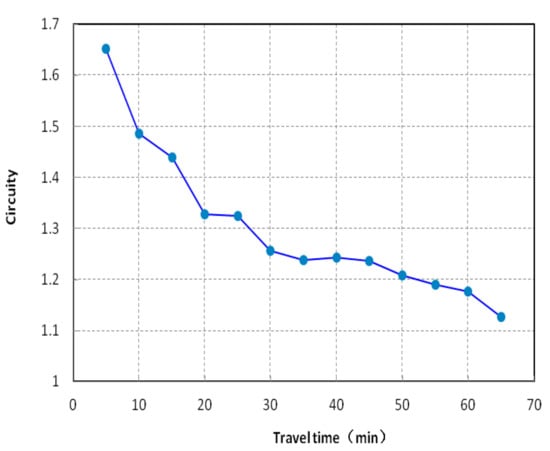 Figure 10 presents the linear relationship of travel time and travel circuity. Travel circuity decreased with the increase of travel time. The value of travel circuity declined fast in 5–10 min of travel time. The probability and degree of travel circuity for a five minutes travel time were higher than for that of 10 min, which might be formed under the influence of the density road networks.