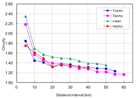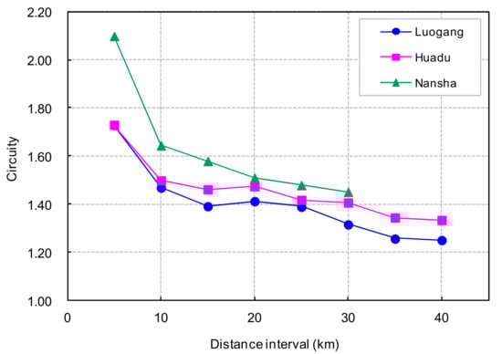 Through statistical analysis of the Guangzhou travel circuity in Figure 11, the relationship between travel circuity and travel distance was found, that is, travel circuity decreased with the increase of the travel distance. It can be noted that the circuity of the travel distance within 5–10 km declined with the fastest speed, which means that the 5 km of travel distance had a higher probability and stronger circuity than the 10 km travel distance. Thus, it was influenced by the characteristics of the road network structure and travel habits.