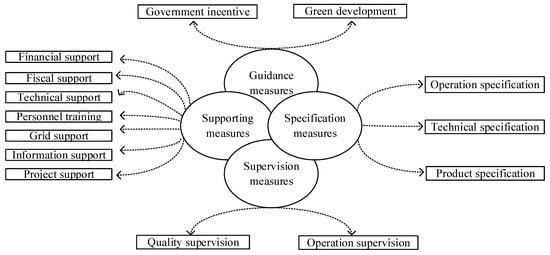 According to the difference of the Chinese government’s roles in the PV industry policy, the PV industry policy measures were divided into four types: guidance policy measures, supporting policy measures, specification policy measures, and supervision policy measures (hereinafter referred to as guidance measures, supporting measures, specification measures, and supervision measures, respectively). These four aspects encompass a total of 14 small groups as shown in Figure 1. We used the binary method to code the virtual variables for the policy measure dimension. If a policy adopted a policy measure, the value of the corresponding variable was assigned a value of 1; otherwise, it was assigned 0. Considering that a single policy may have adopted a variety of policy measures, each policy measure involved in the policy was assigned a value of 1, while other variables that were not involved were assigned a value of 0.