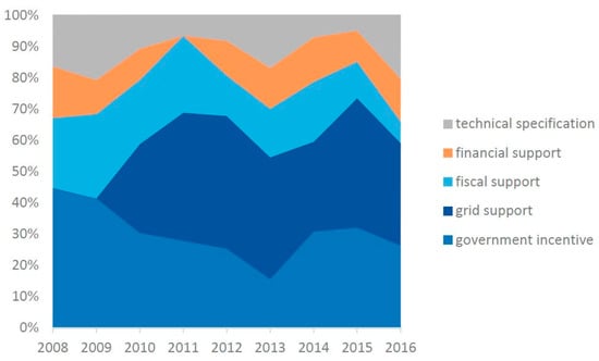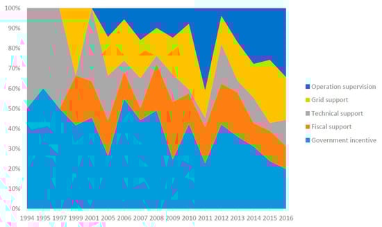 As shown in Figure 2, the five most important contributions to the enforcement strength intensity of policy measures for the national PV industry are government incentive, grid support, operation supervision, technical support, and fiscal support. In the early stage of China’s PV industry, the government mainly issued incentive policies and gave technical supports to enhance the innovation capacity and provide “soft” power for the development of the industry. The government continues to provide substantial financial and tax support for the PV industry, which are important forces to stimulate the development of the industry.