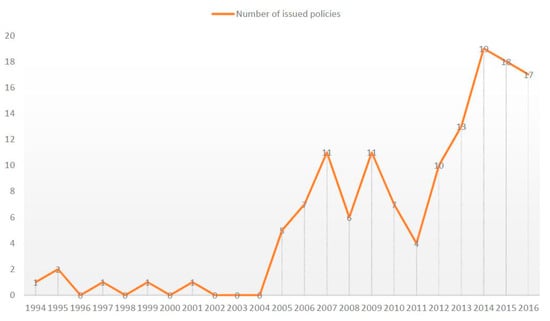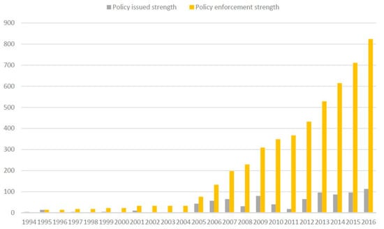 Research on the effect of policy should avoid an analysis that considers only the perspective of the policy instrument. Rather, an acceptable analysis should combine several aspects, such as policy strength, policy objective, and the policy-issuing department. Breslin [] quantified central and local governments’ foreign direct investment policies from 1978 to 2000, and empirically studied the effectiveness of China’s foreign direct investment policies on the basis of the policy measures dimension. However, the selection of policy measures was limited and the study did not consider policy strength. Huang [] analyzed the historical evolution of China’s 1980–2005 innovation policy on the basis of policy strength and policy type. However, the study was only a descriptive statistical analysis of innovation policy, and it did not involve a study of policy content. Peng et al. [] quantified China’s technological innovation policy on the basis of policy strength, policy measure, and policy objective, and studied the evolution path and performance of China’s technological innovation policy. Wang et al. [] combined policy content with policy strength in their research of China’s wind power industry policy, and considered policy departments and the form of policy formulation.