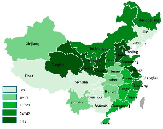 The highest-level regions are Beijing-Tianjin-Hebei region, Gansu, Qinghai, Jiangsu and Shaanxi Province; the second-level regions are Nei Monggol, Heilongjiang, Shandong, Shanxi, Zhejiang and Ningxia Province; the third-level regions are Shanghai, Anhui, Jiangxi, Guangdong, Fujian and Hainan Province; the fourth-level regions are Yunnan, Chongqing, Xinjiang, Hubei, Hunan and Henan Province; and the lowest-level regions are Liaoning, Jilin, Guangxi, Guizhou, Sichuan, and Tibet.