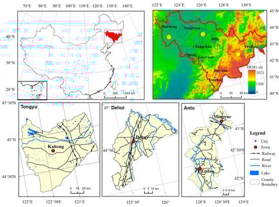 Jilin Province is located in northeast China (40°52′N to 46°18′N, 121°38′E to 131°19′E) (Figure 1). The total land area is approximately 187,400 km2. The altitude drops gently from the southeast to the northwest, with the vast Songnen Plain in the mid-west of the province. The prevalent climate in the study area is a continental monsoon, and the annual average precipitation changes between 350 mm and 1500 mm gradually from east to west. Jilin Province is the largest commercial grain-producing base of China. A study on its rural settlements is useful for regional land management and economic development. In this paper, three typical counties, Tongyu, Dehui, and Antu, were selected from different regions as study areas.