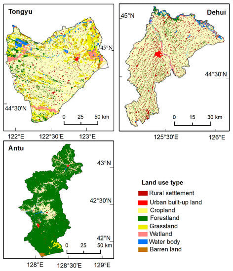 Land use maps of Tongyu, Dehui, and Antu.