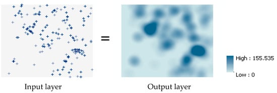 The KDE calculates the density of features in a fixed neighborhood around those features (Figure 3). The distance from the point to the reference position is calculated using the mathematical function to obtain the sum of all of the surfaces in the reference position and the peaks and kernel of these points are established to produce a smooth and continuous surface.