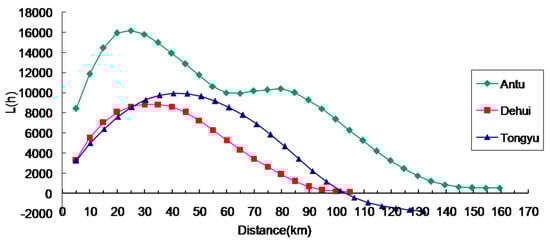 The results of the analyses of Ripley’s L(d) function are shown in Figure 4. The curve shows that the degree of the cluster of rural settlements of Antu is the highest, and the value of Tongyu is next. The L(d) curves for Antu and Dehui are all positive values, suggesting a higher agglomerated degree, even at the larger scale. However, there are still changes in the agglomeration level of rural settlements at smaller scales. The curve of Antu county showed two peaks (appearing at approximately 20 km and 80 km), indicating that the radiation effects of towns were obvious and rural settlements grew around two important towns. The L(d) curves of Dehui county maintained a rising trend over 0–35 km, reached a maximum at 35 km, and changed slightly, indicating that the agglomeration level firstly increased, and then remained smooth as the distance increased. The L(d) curve of Tongyu county had a similar trend as that of Dehui, but showed clustered characteristics within 105 km, and separated characteristics over this distance.