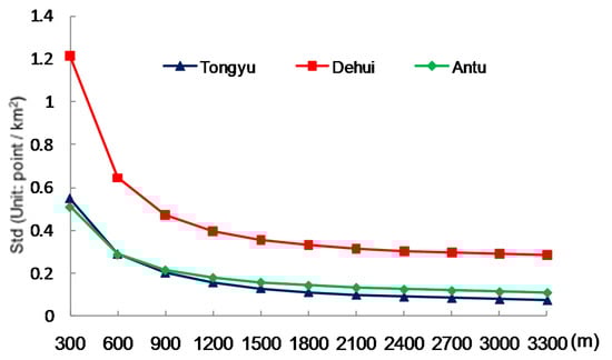 KDE was considered to be an effective method by which density is calculated using a kernel function superimposed over each location. The application of KDE requires the choice of the type of kernel function and the definition of three key parameters: bandwidth, cell size, and intensity [36]. Bandwidth is a very import parameter influencing the value of KDE. Increasing the bandwidth will not greatly change the mean of the density values calculated, but greatly affects standard deviations. The standard deviations of KDE for different bandwidths in the three counties were calculated (Figure 5), and the curve changed slightly when the bandwidth was approximately 2000 m. Therefore, a radius of 2000 m was selected to estimate the kernel density, and the results were divided into four levels.
