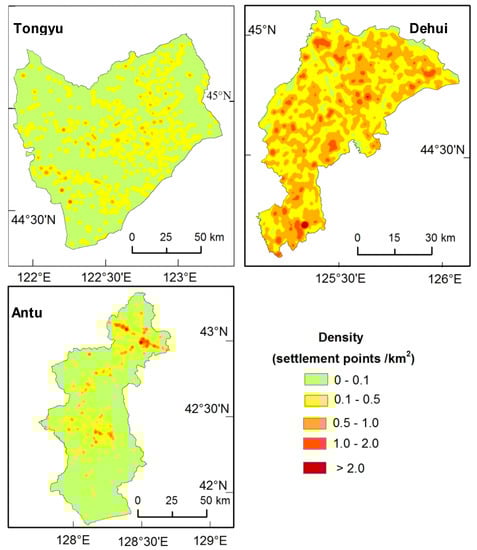 The mean values of the kernel density for Tongyu, Dehui, and Antu were 0.22, 0.32, and 0.21, and the standard deviations of KDE were 0.07, 0.26, and 0.11, respectively, showing that the settlement density of Dehui was larger, and the rural settlements in Tongyu were relatively uniform. The maps of KDE for the three counties looked very different (Figure 6). Influenced by the distribution of sandy land and salinized land, settlements distributed in Tongyu were sparse, and the density value was lower, especially in the northwest and southern parts (Figure 2 and Figure 6). There were many cluster centers in Dehui; therefore, the overall density value was higher. For Antu, the physical conditions in the mountainous area limited the distribution of rural residents, and the higher density values were presented as strips along the valley and main roads, leading to significant heterogeneity of the rural density.