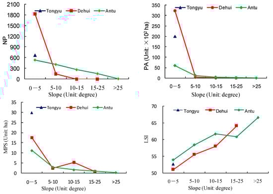 The influence related to terrain was obvious (Figure 7 and Figure 8). Due to the flat terrain and relatively small fluctuation, the influence of terrain was comparatively weak. All of the rural settlements were distributed within 200 m of elevation and a 5 degree slope, while the Tongyu settlements of Dehui were concentrated within 300 m elevation and 10 degree of slope, showing the opposite trend to terrain changes. Located in the mountainous area, the settlements of Antu represented obvious geographical differences. The number, area, and shape indices of settlements for Antu changed differently within and outside of the 800 m elevation range, showing a trend of rising first, and then decreasing. About 95% of the number and area were concentrated in the elevation range between 300 and 800 m. The number of patch (NP), patch area (PA), and MPS of Antu decreased when the slope increased.