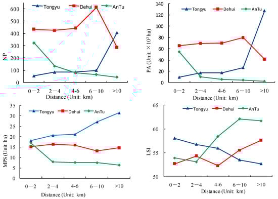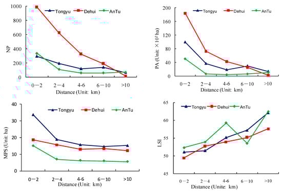 When the landscape index was examined by road transects, we find that the curves of NP and PA for the three counties have similar downward trends when far away from the roads, while that of the LSI showed the opposite (Figure 10). The MPS of Tongyu was the highest among the three counties, and that of Dehui fluctuated slightly across the whole scale of the research.