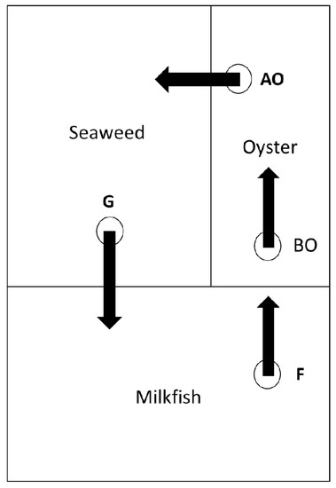 Diagram of an integrated multi-trophic aquaculture system (IMTA). Sampling points of water quality: F (end of fish pond), BO (before oyster pond), AO (after oysters), and G (end of seaweed pond).