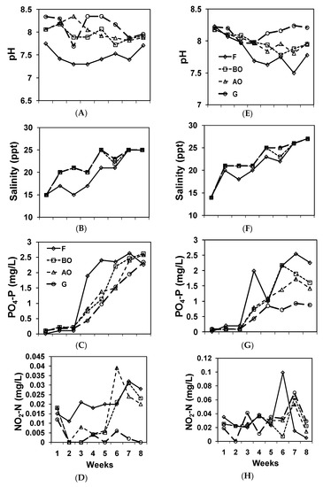 Water quality of sampling points through time. (A) pH, (B) Salinity, (C) PO4−3-P, and (D) NO2−-N of the northern set, (E) pH, (F). Salinity, (G) PO4−3-P, and (H) NO2−-N of the southern set.