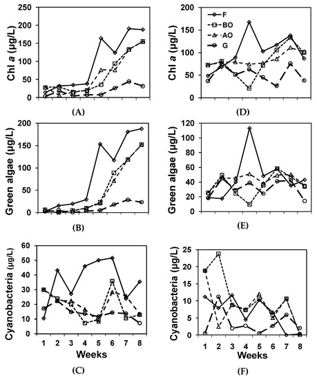 Phytoplankton measurements of sampling points through time. (A) Overall Chl a, (B) Green algae, (C) Cyanobacteria of the northern system. (D) Chl a, (E). Green algae, (F) Cyanobacteria of the southern system.