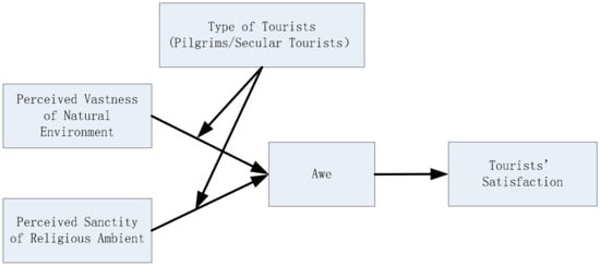 Due to the different tourism motivations, the awe experience of pilgrims and secular tourists may be induced by different stimuli. For traveling in sacred mountains, pilgrims generate a strong religious motivation to have more spiritual experiences. The humility before gods arouses the fear of gods. Secular tourists have a strong leisure motivation and are more likely to feel the stimulation of natural scenery. The sense of “small self” toward the grand nature makes the individual generate the sense of awe for nature. In a study on awe experience between religious believers and non-religious people, Preston and Shin [39] found that the spiritual experiences, including the personal transcendence, connection, and wonder, can induce people’s awe experience. However, the awe of religious believers is from the spiritual experiences of explicit religious events or life/death events. The awe of non-religious people is more likely from the spiritual experience of nature, peak, science, yoga, or meditation. For traveling in sacred mountains in China, pilgrims’ awe experience is from statues, religious instruments, religious rituals, and religious events. The secular tourists’ awe experience is more likely to be generated in the steep mountains, panoramic view, towering trees, and other natural scenery. Therefore, the type of tourists (pilgrim/secular tourists) may moderate the relationships of the perceived vastness of the natural environment and the perceived sanctity of religious ambience on the awe emotion. Specifically, in the scenario of religious places, the impact of pilgrims’ perceived vastness of the natural environment on awe should be weaker by comparing with the secular tourists. However, the impact of pilgrims’ perceived sanctity of religious ambience on awe is stronger. Further, the type of tourists (pilgrim/secular tourists) also moderates the awe experience impacts on the relationships of the perceived vastness of natural environment and the perceived sanctity of religious ambience on the tourists’ satisfaction. That is, the mediation relationship of awe on tourists’ sense of perceptual environment/religious atmosphere and satisfaction depends on whether the tourists are pilgrims or secular tourists.