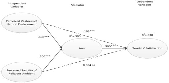 H3 assumes that there is a full mediation effect between the perceived environment (natural environment and religious ambience) and tourists’ satisfaction through the awe experience. The estimates for the indirect effects were provided for the structural equation model to address these hypotheses (Table 4). According to mediation test approaches by Baron and Kenny [45], H3a receives partial support (p < 0.001). The relationship was not fully mediated by the awe experience since the direct relationship between the perceived vastness of natural environment and tourists’ satisfaction remained significant (p < 0.001) (Table 4). This suggests that the awe experience partially mediates the relationship between the perceived vastness of natural environment and tourists’ satisfaction [46]. H3b is supported (p < 0.001) as the direct relationship between the perceived sanctity of religious ambience and tourists’ satisfaction was not significant when awe experience was added as a predictor in the regression model (Table 4). Thus, awe experience shows a full mediating effect on the relationship between the perceived sanctity of religious ambience and tourists’ satisfaction. All proposed mediation effects are supported.