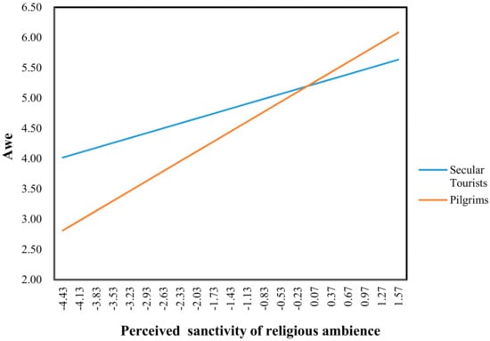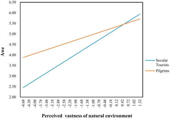 The moderating effects (H4) of type (pilgrims/secular tourists) of tourists on the relationship between the perceived environment (natural environment and religious ambience) and visitors’ awe were undertaken using ModProb (a script developed by Preacher and Hayes [47]). The interaction term model can provide an estimate and test the significance of the moderating effect. The results presented in Table 3 indicate that the type of tourists is a moderator in the relationship between the perceived vastness of natural environment and awe experience (, and the relationship between the perceived sanctity of religious ambience and awe experience (. After testing the interaction term model, simple slope analysis is performed to compare the slopes of two types of tourists. Figure 3 and Figure 4 show the results of simple slope analysis. In Figure 4, the slope of the regression line of secular tourists is larger than the slope of the regression line of pilgrims. This implies that awe experience is more likely to induce by the perceived vastness of natural environment for secular tourists than for pilgrims. However, in Figure 5, the slope of the regression line of secular tourists is smaller than the slope of the regression line of pilgrims. This implies that awe experience is more likely induced by the perceived sanctity of religious ambience for pilgrims than for secular tourists. The results support H4a and H4b.