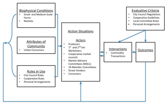 The role of the action situation is vital to this analysis, as the action situation is the social space where groups come together to interact with one another [38]. Understanding the types of interactions that the city’s actors maintain with one another, and the context in which those actions are carried out, is paramount to understanding the institutional arrangement of the food system in Zambia’s primary city.