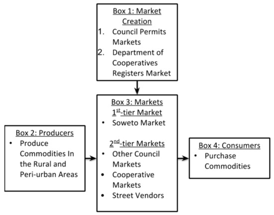 Urban food systems feature a wide range of actors, formal and informal governance arrangements, differing environments in which actors interact with one another, and a diverse value chain through which produce comes into the hands of consumers. Lusaka’s food system begins with the creation of markets (Box 1 of Figure 3). Cooperative markets begin as illegal informal institutions, which materialize during the expansion of the city’s non-sanctioned residential areas (Lusaka City Council, personal communication, 12 April 2017). These informal bottom-up driven markets gain legitimacy through legal registration with the Ministry of Commerce’s Department of Cooperatives. The majority of Lusaka’s markets are cooperative in their governance, but over time a small handful have switched to council markets in order to access city council resources. Alternatively, city council-managed markets must go through a formal permitting process before recognition.