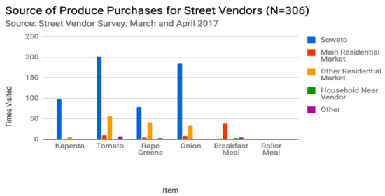 This situation has two implications for the city. First, it is a boon for the city, in that street vendors are free to meet consumer demand directly. Street vending developed as a response to ensuring the provision of goods and services that are not provided by authorities [39], and the activity has continued to spread throughout Lusaka’s disparate residential areas. Alternatively, the widespread use of street vendors to meet food needs is precarious for city managers. Without a governing body to ensure minimal requirements regarding the quality and handling of produce that is offered by street vendors, the city’s efforts to maintain and improve public health may be affected.