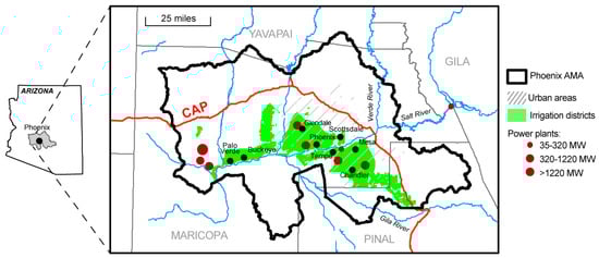 The Phoenix Active Management Area, including the main cities, rivers, irrigation districts, large-scale power plants, and the Central Arizona Project aqueduct.