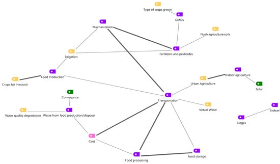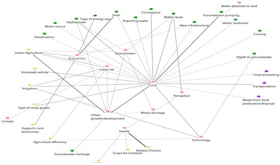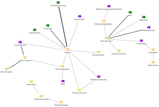 Code co-occurrence model of water-food system interactions. The model illustrates the association and intersections among codes. The width of the line is dependent upon the number of intersections. Code tag color indicates interaction type with green representing energy-water interactions, yellow for water-food interactions, purple for food-energy interactions.