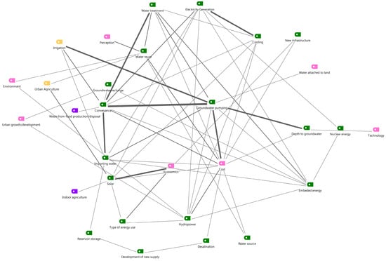 Code co-occurrence model of water-energy system interactions. The model illustrates the association and intersections among codes. The width of the line is dependent upon the number of intersections. Code tag color indicates interaction type with green representing energy-water interactions, yellow for water-food interactions, purple for food-energy interactions, and pink for three-way interactions.