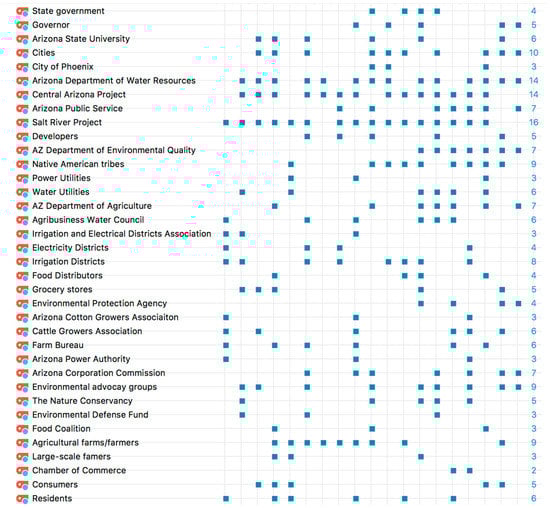 The second major aim of our research is to identify stakeholders for the FEW nexus in the Phoenix AMA and to illuminate the relationships among the actors and organizations involved in food, energy, and water systems. Our approach combines elements of the analytical and reconstructive methods []; we developed an initial scheme to guide the sampling strategy, as detailed earlier, and then asked those stakeholders to develop a reconstructive categorization. We asked participants to identify actors, organizations, and institutions who have (or should have) interest, power, and influence for food, energy, and water systems and to specify those with the most power and influence and those most relevant to the nexus. Figure 6 provides an overview of the most identified stakeholders.