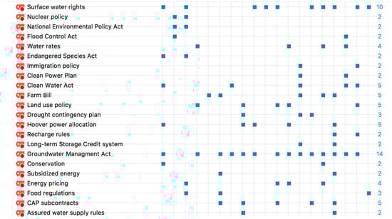 The final aims our study are to identify stakeholders’ views on current policies relevant to nexus governance in the Phoenix AMA as well as their recommendations for policy reforms and new policies to promote integrated governance. Our participants discussed many laws, regulations, policies, and institutions at the national, state, regional, and local levels. Influential federal laws and policies include Endangered Species Act, Clean Water Act, National Environmental Policy Act, Farm Bill, Clean Power Plan, and Federal Land Management and Policy Act. Figure 7 provides an overview of the most identified policies and regulations that affect the FEW nexus in the Phoenix AMA.