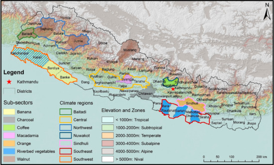 Nepal lies in the Himalayas on the Asian subcontinent and covers an area of 147,181 km2 and an elevation range from 70 m in the south to 8848 m at the peak of Mount Everest in the northeast. Its climate is correspondingly diverse, dividing the country into six major climate zones: the tropical zone (below 1000 m), the subtropical zone (1000–2000 m), the temperate zone (2000–3000 m), the subalpine zone (3000–4000 m), the alpine zone (4000–5000 m), and the nival zone (above 5000 m), where there is no human habitation or agricultural use. The study was conducted in 14 districts of Nepal using the example of following sub-sectors: banana, charcoal, coffee, macadamia, oranges, riverbed vegetables and walnut (Figure 1). To assess the current climate and predicted changes, we grouped the districts into seven regions: the Northwest, Southwest, Central and Southeast and the districts Baitadi, Nuwakot and Sindhuli individually investigated due to their different climatic setting.