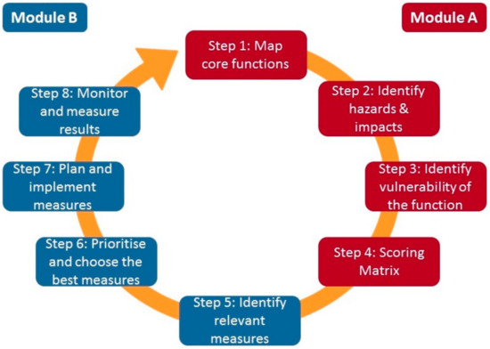 We followed the approach to climate risk and vulnerability assessment of market systems, which combines the adaptation process [47] using different risk assessment tools [48,49,50] and the market systems development project cycle [45] as suggested by HELVETAS Swiss Intercooperation [35]. This combination leads to an 8-step approach with two modules (Figure 2): Module A assesses the risks and vulnerabilities of sub-sectors and prioritizes them at the design and planning stage. Module B identifies and implements adaptation and disaster risk management measures to be incorporated in the general operations and activities of the most suitable market actors.