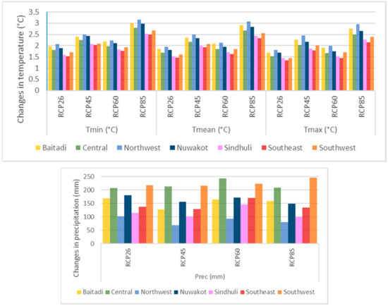 The calculated temperature changes for 2050 agree with McSweeney et al. [10] and forecast the largest changes in the west of Nepal. However, our analysis also shows that the changes must be viewed in more detail: temperature changes are expected to be larger in the mid-hills (Baitadi) and mountainous areas (Northwest) than in the Tarai (Southwest). Our data also agree with the general increase of annual precipitation [10,57] and we can show that the increase is largest in the Central and Southwest. Yet our data does not reflect detailed information about monthly precipitation patterns, such as the onset of the monsoon, its patterns for individual months and the forecasted changes, as is found in a study for the Koshi river basin by Bharati et al. [58], who show that the maximum precipitation is higher during the monsoon and post-monsoon and lower during winter in RCP4.5 and even more pronounced for RCP6.0.