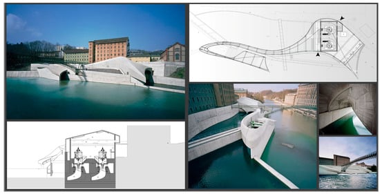 In order to minimize the visual impact of the plant, a walkable green-roof top has been installed on the hydropower plant, serving as a “green platform” capable of accommodating cyclists, allowing them to enjoy the view of the river from another point of view (Figure 7 and Figure 8). This is made of laminated wood, associated to the concrete substructure, and is composed of three pairs of main beams. These are linked to secondary modular beams, strengthened by steel cords; the cantilevers are supported by struts anchored to the concrete walls. The upper surface finishing package is composed of two layers of multilayered boards between which the insulation has been inserted, the anti-root waterproofing membrane, the rainwater collection tanks, the geotextile and, finally, the extensive green-roof top.