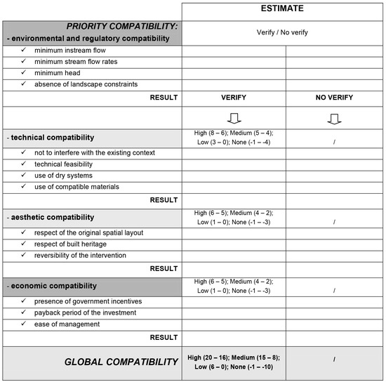 This process has allowed to develop a “global compatibility” level, evaluated with a score, which will be the synthesis of all preliminary analyses and evaluations carried out [25]. This compatibility is assessed through a series of indicators, of which the first is the preliminary one. In fact the indicator relating to environmental and regulatory compatibility has higher priority than the other ones: if it is not satisfied, the relating design solution cannot be implemented. We have verified, in fact, the presence of minimum instream flow, of minimum flow rate, of minimum head, and the absence of landscape constraints and environmental risks.