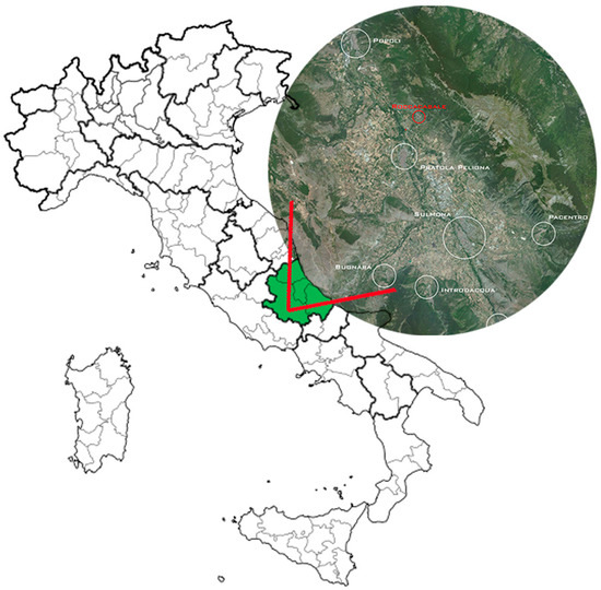 Among the sites surveyed in the “Study to support the management of Water Resources for Hydropower Generation” of the Abruzzo Region [26], one has been chosen to test the proposed methodology that met the preliminary survey criteria: it is located in an isolated mountainous area and in a place of high landscape value. The site is made up of a stretch of the river Aterno, where the water course flows towards the city of Pescara (Figure 3). The subsequent choice of the most suitable section of the river to build a mini hydropower plant has been determined by the preliminary compatibility studies and the availability of historical data.