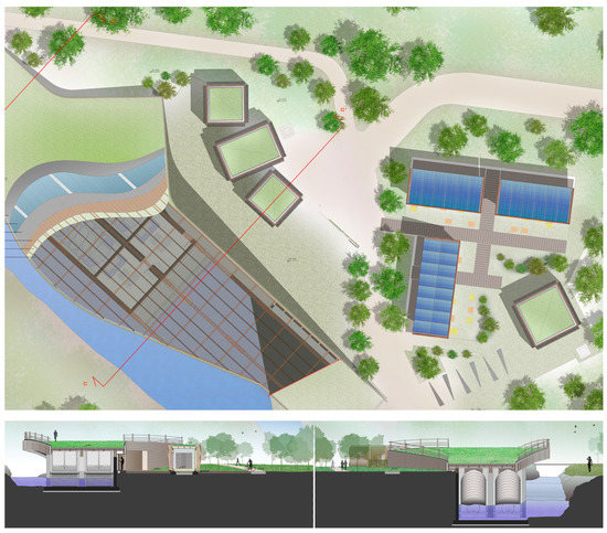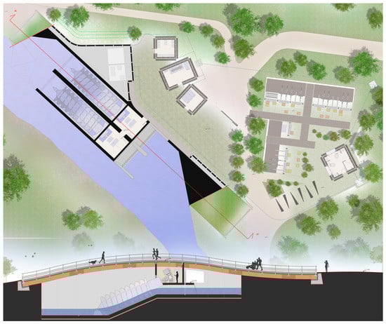 As for the aesthetic aspect, particular attention has been paid to the hydropower station, designed as to create the least possible visual impact. In fact, the visitor arriving in the area involved in the project will see only the three volumes with a wooden frame structure, totally removable, that host the rooms for the measurements and management of the hydropower station. Not far away, there are two small buildings containing the information office and bike-sharing station (Figure 6).