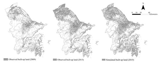 Through the accuracy assessment of urban growth model, it could be found that although the urban growth model produced an acceptable mean fuzzy similarity of the simulated changes and the observed changes from 2009 to 2015, poor spatial fitting appeared in southern areas of Ningbo, and the simulated results overestimated the extent of new built-up lands in these areas (