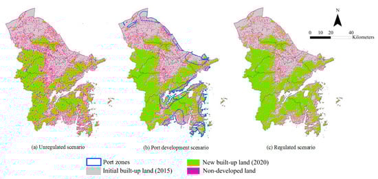 The UGB under port development scenario corresponded to a situation in which local policy, especially the “Port Economic Circle” strategy, guided the urban growth direction, and ecological protection was taken into consideration in this scenario. It produced more development of built-up lands around the port cluster areas, and a little complex and separated urban space structure. Further, the shipping channel capacity of the port economic circle was promoted with the help of a comprehensive transportation network layout. The UGB under this scenario should be further improved to support efficient port economy development in Ningbo.