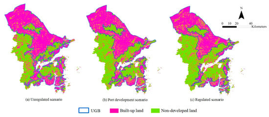 Figure 3, urban development probabilities around transportation and ports were relatively high in previous years. The simulated UGBs followed the development trend and extended reclamation areas that have good accessibility to Hangzhou Bay Bridge and Shanghai. In central areas, the planned UGB designed a “Green Ring” around the central city, but there was no similar design in the simulated UGBs. Through setting this green corridor, the planner aimed to avoid unlimited urban expansion, and to promote the coordination of the city spatial structure and ecological pattern. The simulated UGBs lacked this beneficial subjective human design. In southern areas, the planned UGB had larger areas than those in the UGBs under port development and regulated scenarios. In view of the development lag of southern areas have been explained previously, the two simulated UGBs were more suitable for these areas’ urban growth in the future. These findings recommended that the UGBs under port development and regulated scenarios were superior to the planned UGB, but these two simulated UGBs can be improved by considering rewarding subjective planning and design.