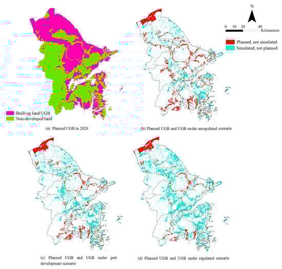 To verify the advantage of this UGB delimitation method, we conducted a comparative analysis of the simulated UGBs in three scenarios and the planned UGB in 2020 established in the NCMP. The planned UGB was defined based on the results of urban planning zoning, namely that we merged suitable construction zone and construction control zone, and delineated the boundaries of these regions. Many inconsistencies have been found between the simulated UGBs and the planned UGB (