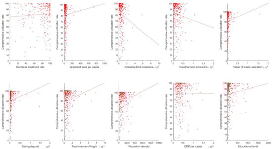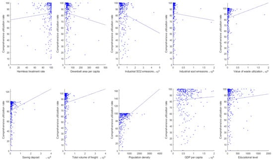 For the variable of greenbelt area per capita, according to the China City Statistical Yearbook 2010 and 2016 and the environmental Kuznets curve, it is not difficult to find that cities in China with high greenbelt area per capita normally have a low industrial development level (except for a few highly developed cities) and low industrial solid waste disposal abilities [18]. That caused the negative correlation of the greenbelt area per capita and industrial solid waste utilization rate. Only if the majority of Chinese cities change current heavy industrial-based development modes and establish effective industrial solid waste disposal systems, will the correlation of the greenbelt area per capita and comprehensive utilization rate of industrial solid waste be positive.