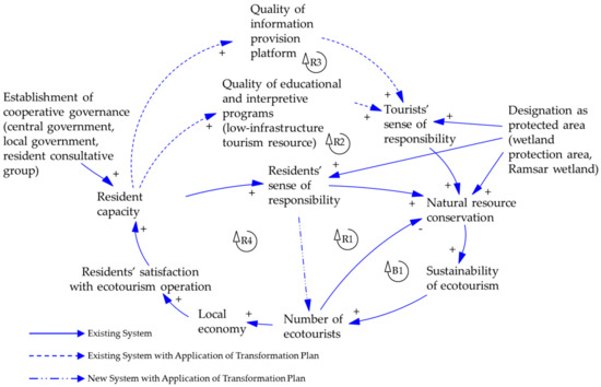 Figure 1 shows the causal map of the low-infrastructure and resident-initiated ecotourism system evidenced in the Suncheonman Bay Ecotourism Council. Three feedback loops were formed through the process: (1) damage to natural resources by tourists (Figure 1, B1); (2) natural resource management by local residents (Figure 1, R1); and (3) natural resource management by tourists (Figure 1, R2 and R3). In any type of ecotourism system, the increased number of tourists threatens natural resource conservation efforts; consequently, it reduces the sustainability of ecotourism and decreases the number of ecotourists. In the long term, however, a balancing loop (Figure 1, B1) is formed that positively affects conservation efforts through self-purification [12]. In this system, cooperative governance formed by the central government, the local self-governing body and residents in the early stage of tourism development support the enhancement of resident capacity, which reinforces loops R1 and R2. This implies that the formation of resident-led cooperative governance intensifies resident (supply) and ecotourists’ (demand) sense of responsibility for natural resource conservation, which supports the sustainability of ecotourism [31].