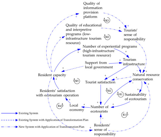 Experiential ecotourism participants tend to be soft ecotourism tourists who have a lower sense of responsibility, are not willing to participate in active natural resource conservation and are less likely to endure inconveniences from a lack of tourism facilities. The transformation plan (Figure 2, R2 and R3) that was introduced includes provision of online information, pre-training for experiential program participation and education on possible inconveniences during the ecotourism experience. With the implementation of the new transformation plan, tourists’ level of satisfaction may also increase if they become voluntary conservationists through training.