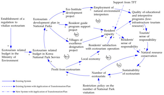 With the spreading perception that ecosystem conservation can aid local economic growth through ecotourism, an increasing number of local self-governing bodies and communities are proposing protection area designation [51]. This designation contributes to the conservation of natural resources and can instill a sense of responsibility among residents and tourists. In this context, the designation of an area as a protection area reinforces the positive loop (Figure 1, R1–R3) and weakens the stagnant structure of ecotourism (Figure 1, B1).