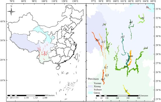- Li, B.Y. On the boundaries of the hengduan mountains. J. Mt. Res. 1987, 2, 74–82, (In Chinese with English Abstract). [Google Scholar]