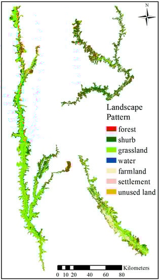 Landscape metrics are useful tools for quantifying the spatial patterns of landscapes after the appropriate grain size or extent is determined []. We used a grain size of 75 m to calculate all landscape metrics at two levels to observe the landscape patterns of arid valleys.