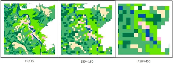 Landscape pattern data were transformed into GRID raster data for FRAGSTATS 4.2 [] in ESRI’s ArcGIS 10.0 []. We selected 22 landscape grain sizes from 15 m to 450 m. We used a grain-size interval of 15 m between 15 m and 210 m, and an interval of 30 m between 210 m and 450 m. Figure 3 shows images of the same site using grain sizes of 15 m, 180 m, and 450 m. As the patch resolution is reduced, landscape boundaries become smoother and detail is lost.