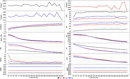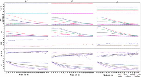 In FRAGSTATS, 22 grain sizes for six landscape metrics at the class level were calculated for the three samples, and response curves were generated for landscape size and performance index according to grain size (Figure 5).
