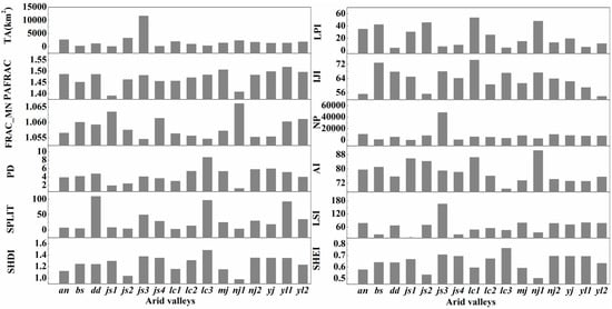 Landscape metrics of arid valleys at the class level were calculated for the different basins (Figure 7).