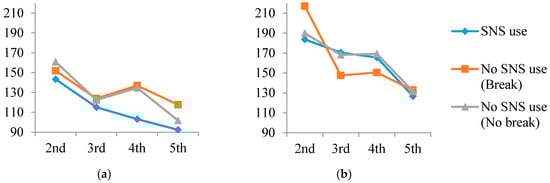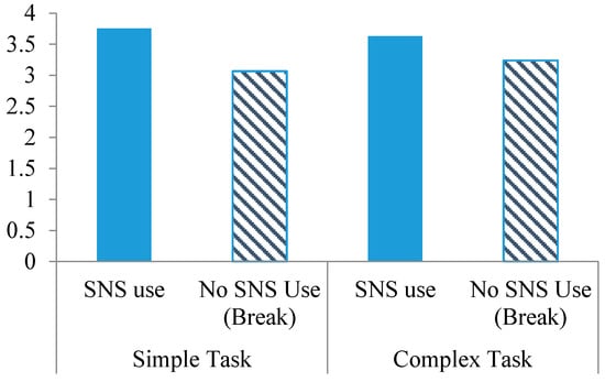 As the no SNS use and no-break group did not have their psychological arousal measured between pre-treatment scheduling and post-treatment scheduling, only the comparison between the SNS use group and break group was made. As expected, the SNS use group shows higher psychological arousal scores than the simple break group for both types of task, supporting Hypothesis 1. The result is illustrated in Figure 1.