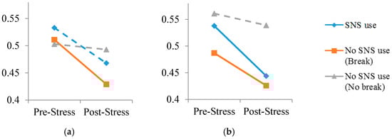Figure 2 indicates pre- and post-stress levels of each group. Post-stress levels of all groups seem to be decreased when compared to their pre-stress levels, but this decrease is statistically significant in only three groups: (1) simple task, no SNS use-break group; (2) complex task, no SNS use-break group; and (3) complex task, SNS use group. The dotted lines represent the groups whose change in stress level was not statistically significant.